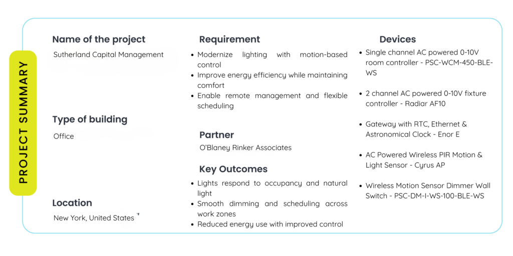 Inside the offices of Sutherland Capital Management in New York City, the lighting setup needed a smarter touch. In a space that sees activity shift throughout the day, the goal was to introduce lighting that adjusts automatically, saves energy, and feels effortless to manage.