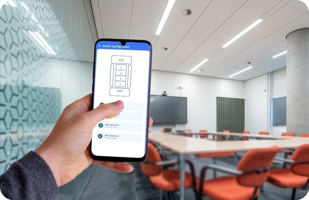 Each button can be tailored for specific functions, whether it's controlling favorite luminaries, all luminaires, or groups. It's a versatile tool that adapts to your lighting needs, all managed through the convenience of a mobile app.