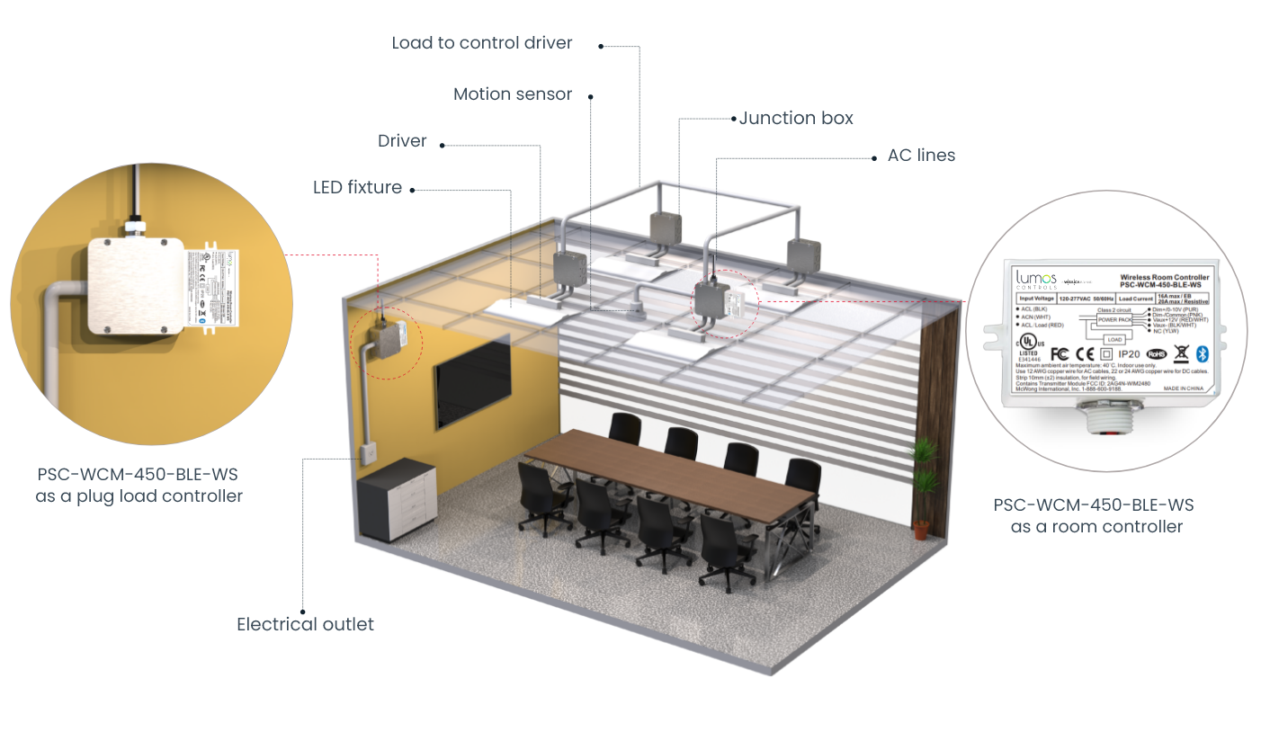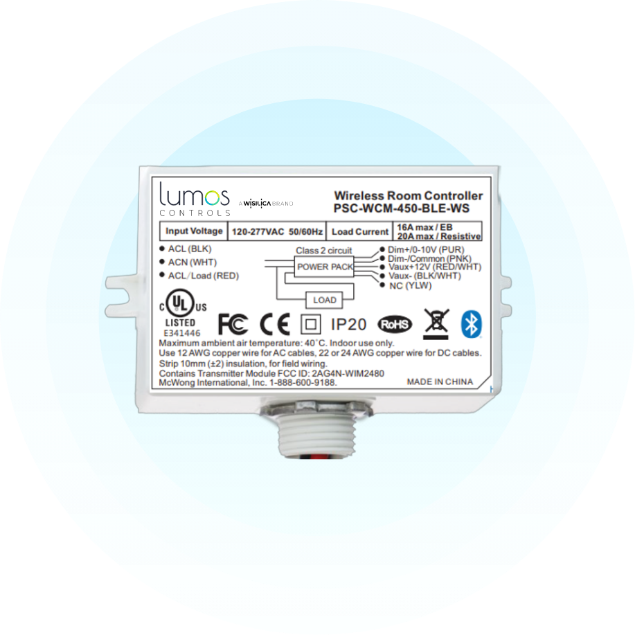 PSC-WCM-450-BLE-WS is a BLE5.2 controllable, single-channel 0-10V room controller. Designed to enhance energy efficiency and convenience. This device is powered by 100-277VAC and features a 20A relay, making it perfect as both a room and plug-load controller. With Class-2 single-channel 0-10V dimming output and 12V auxiliary output, it’s equipped to manage multiple light fixtures effortlessly.