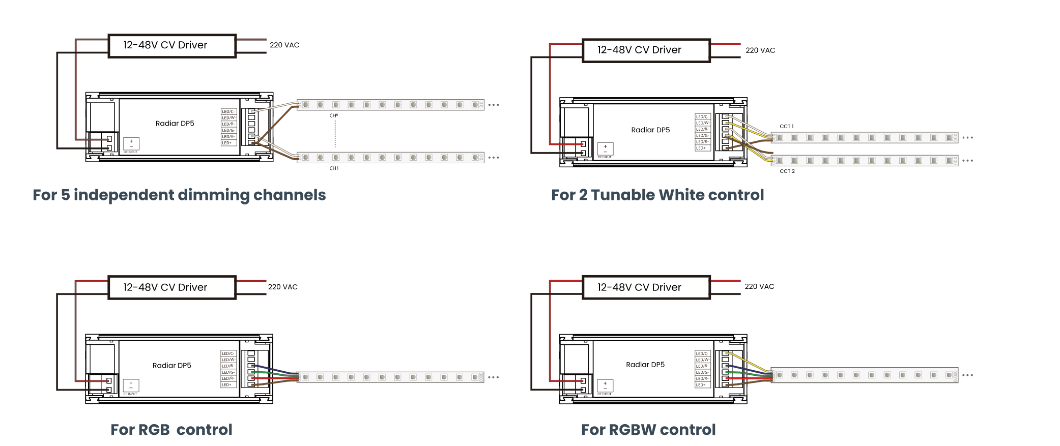 You're in charge of creating the perfect lighting environment. Whether you want to control LED strip with 5 independent dimming channels, tunable white control, RGB control or RGBW control Radiar DP5 can seamlessly adapt to your preferences.