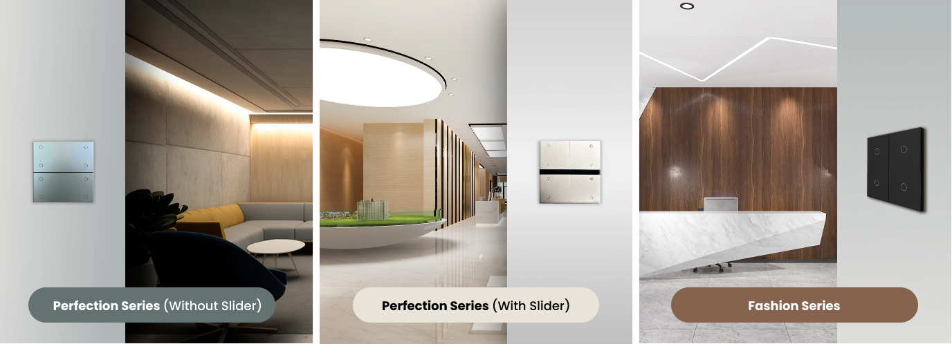 This enhanced version of the Perfection Series adds a slider touch strip to its functionality, offering a dynamic and user-friendly way to control lighting. The touch slider smoothly adjusts intensity or color temperature, seamlessly linked to two specific button configurations for precise operation. Designed as a wall-mounted control panel, it combines functionality with flexibility, making it an excellent choice for modern spaces.